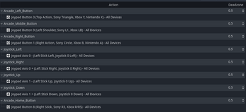 Arcade Mappings (Screenshot of Godot's Input Settings, some of them are weird like the Middle button being clicking down on the right stick of a controller)
